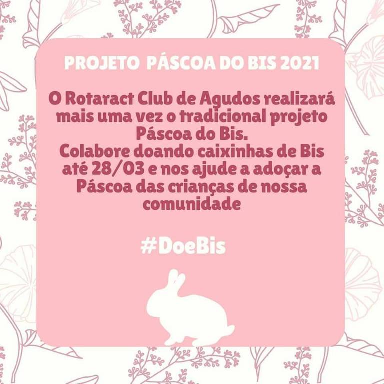 O Rotaract Club de Agudos, formado por jovens líderes a partir de 18 anos, realizou o tradicional projeto "Páscoa Do Bis" que arrecadou e distribuiu 429 caixas de chocolate nesta Páscoa.
