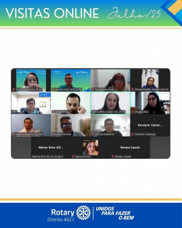 Entre os dias 21 e 24 de julho de 2025, a Governadora Márcia Brito, acompanhada por sua equipe da secretaria, realizou mais seis visitas de trabalho com clubes do distrito, por meio de reuniões virtuais.