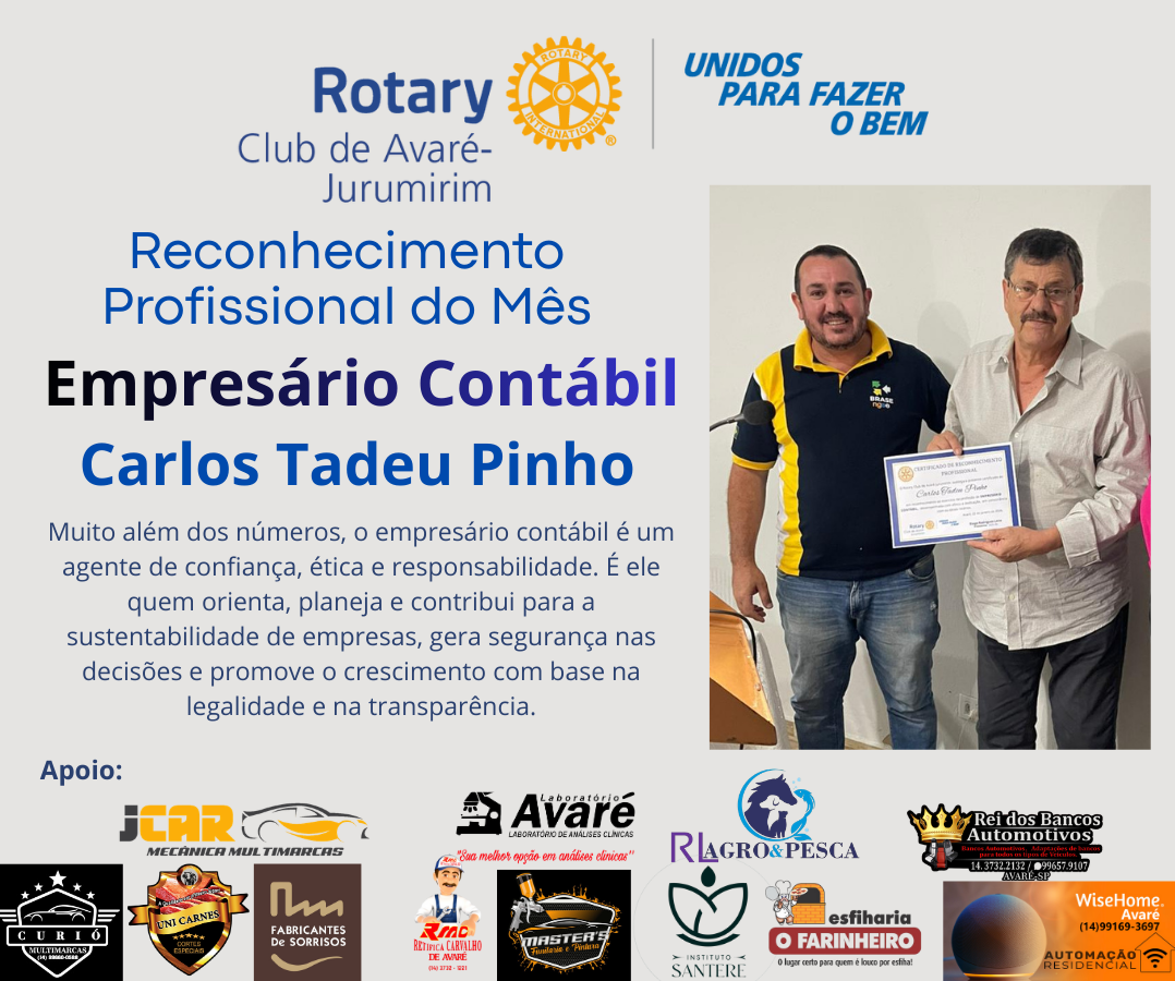 O *Rotary Club de Avaré Jurumirim* teve a honra de, no mês de janeiro, prestar seu Reconhecimento Profissional ao *empresário contábil*, destacando uma trajetória marcada pela ética, competência e compromisso com o desenvolvimento econômico e social da nossa comunidade. O agraciado foi o empresário contábil Carlos Tadeu Pinho.